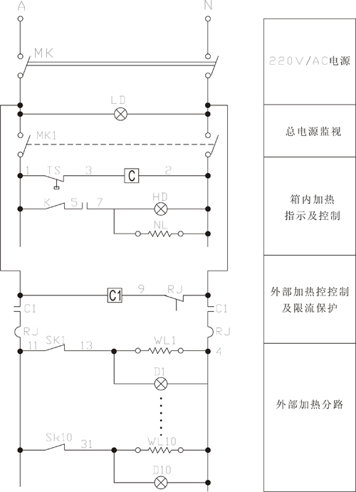 圖1 帶管路伴熱的保溫箱電氣原理圖