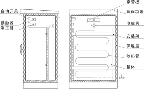 5、保溫箱的加熱方式也采用蒸汽伴熱。箱內(nèi)裝有散熱管,電磁閥及溫控裝置,以保證箱內(nèi)溫度保持在設(shè)定的范圍內(nèi)。(見圖3)