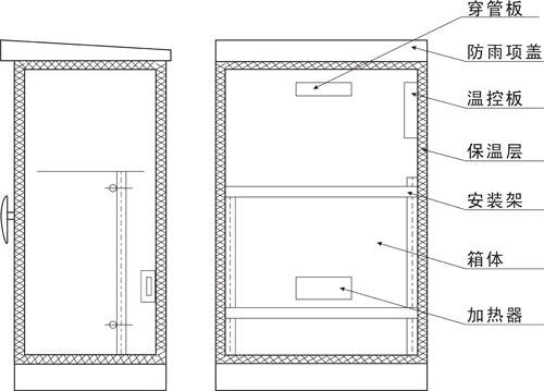 4.保溫箱內(nèi)壁敷設(shè)20mm厚的保溫層。箱內(nèi)裝有加熱系統(tǒng)和溫控裝置。電加熱器功率由用戶自定。并可附設(shè)管路伴熱電源及溫控裝置。