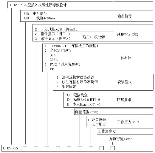 UHZ-50/S-UR/UB系列插入式磁性浮球液位變送器選型表
