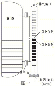 液位計采用連通器的原理。使容器內液體等高引入到液位計主體管內。在主體管內的漂浮浮球組件,根據浮力原理和磁性藕合原理。在主體管外附靠著能反映磁現象的翻柱作為液面位置的顯示。隨文體管內液位的變化,浮球組件的高低也相應變化。從而使主體管外的翻柱作180度的翻轉,當液位上升時,翻柱由白色轉為紅色,當液面下降時,翻柱由紅色轉為白色。顯示器的紅,白界位處為容器內介質液位的實際高度。從而實現液面的檢測目的如圖一所示。
