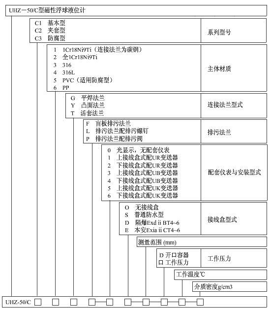 UHZ-50/C型系列側裝式磁性浮球液位計產品選型表