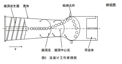 當流體通過螺旋形導流葉片組成的旋渦發生體后,流體被強迫繞旋渦發生體中心劇烈地旋轉,形成旋渦流。旋渦流加速,沿流動方向經縮徑段,流動強度增強。當旋渦流進入擴散段后,在導流體回流的作用下,該旋渦產生二次旋轉運動,即旋渦進動。二次旋渦進動的頻率與流量成正比。當流量計設計得當時,在很寬的流量范圍內,旋渦的頻率與流量成線性關系。該頻率由壓電傳感器檢測,由流量積算儀進行運算和處理。