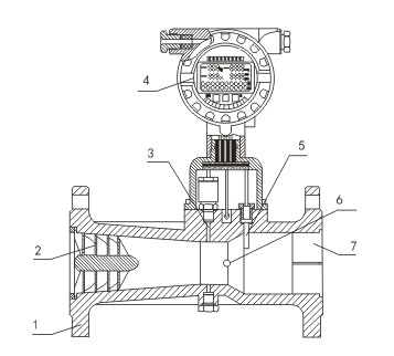 1、殼體 2、旋渦發生體 3、壓力傳感器 4、流量積算儀 5、溫度傳感器 6、壓電傳感器 7、出口導流體
