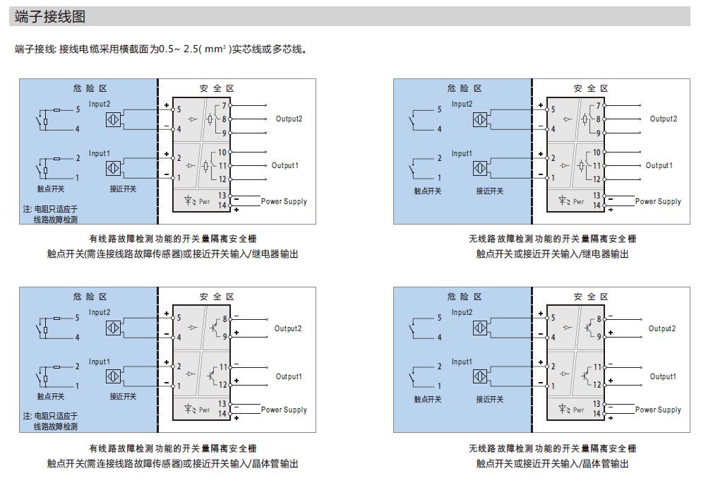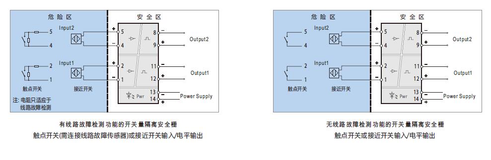 (說明: 當用到線路檢測功能時,如果需要使用機械觸點開關作為輸入設備,必須在輸入回路中連接線路故障傳感器,以避免開關量隔離安全柵將機械觸點開關正常的通斷誤當做輸入回路的斷路或短路故障。)