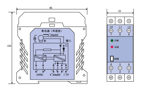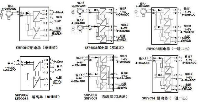 | 配電器(單通道) | SWP-9047 | 4~20mADC | 4~20mADC或1~5VDC | 它向兩線制變送器提供配電電源,并將變送器的信號隔離轉(zhuǎn)換為輸出 |