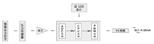 儀表通過壓力傳感器把壓力信號變為電信號,再由前置放大器把此電信號放大濾波,送往CPU的A/D轉換模塊進行模擬量到數字量的變換。最后