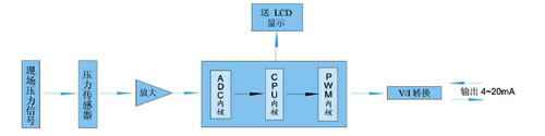 儀表通過溫度傳感器把溫度信號變為電信號,再由前置放大器把些電信號放大濾波,送往CPU的A/D轉換模塊進行模擬量到數字量的變換。最后由CPU進行數據處理并顯示PWM輸出。