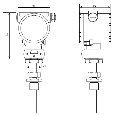 連接,溫度傳感器長度為100mm,鋁合金外殼無現場指示,防護等級IP65,測量范圍0~600℃。