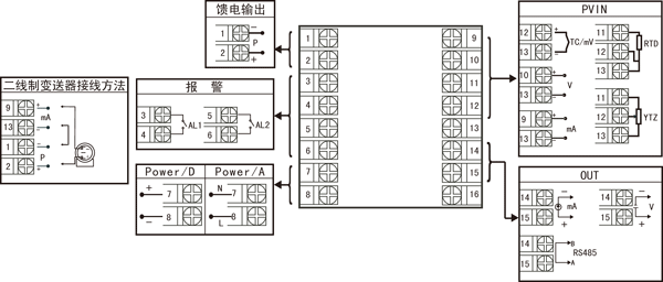 | X 0 1 2 3 4 5 D1 | 無輸出 4-20mA(RL≤600Ω) 1-5V(RL≥250KΩ) 0-10mA(RL≤1.2Ω) 0-5V(RL≥250KΩ) 0-20mA(RL≤600Ω) 0-10V(RL≥4KΩ) RS-485通迅接口(Modbus) | ||