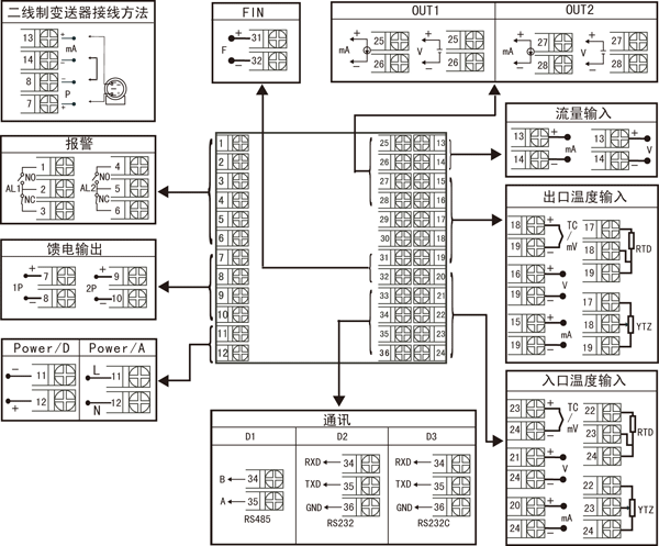 | ①規格尺寸 | ②第一路入口溫度輸入分度號 ③第二路出口溫度輸入分度號 ④第三路流量輸入分度號 | ||