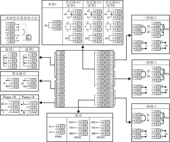 | 1 2 3 | 1路變送輸出 2路變送輸出 3路變送輸出 | D1 D2 D3 | RS-485通訊接口(Modbus RTU) RS232通訊接口(Modbus RTU) RS232C打印接口 |