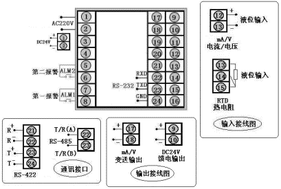 帶控制(或報(bào)警)輸出液位容積控制儀,輸入類型為4~20mA,繼電器控制輸出,帶RS-485通訊,帶上下限繼電器報(bào)警輸出,帶DC24V饋電輸出。