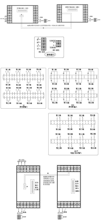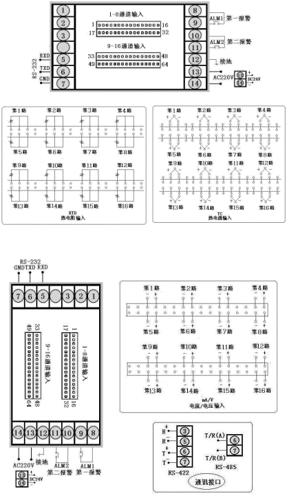 | 十六路巡檢統一控制/報警輸出,通訊方式為RS-232,輸出方式為繼電器輸入,輸入類型為Pt100,第一報警為上限報警,第二報警為下限報警,帶報警保持功能,DC24V供電,豎表。 |