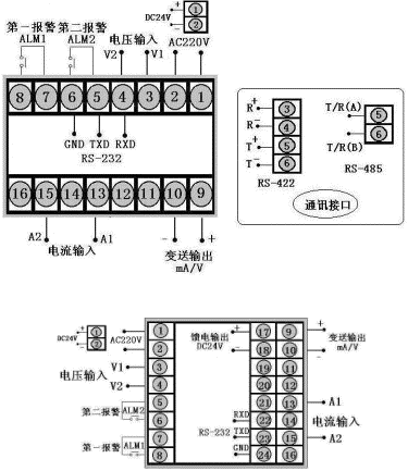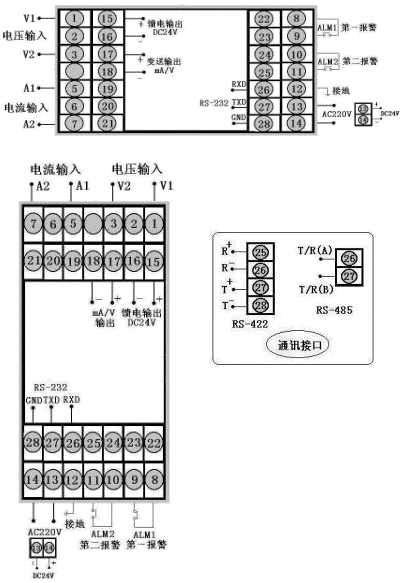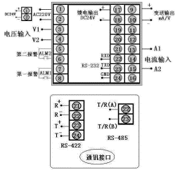交流電壓表,輸入類型為0~5A,繼電器控制輸出,帶RS-485通訊,帶上限繼電器報警輸出,帶DC24V饋電輸出。