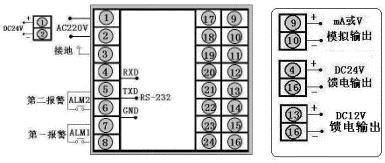 輸出方式 | 01234567 | 無控制輸出繼電器觸點電流 4~20mA電流 0~10mA電壓 1~5V電壓 0~5VSCR-過零觸發脈沖SSR-固態繼電器 | |||||||||