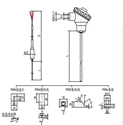 以鎧裝熱電偶配集熱塊為測溫元件用于測量屏過、高過、高再等金屬管壁溫度