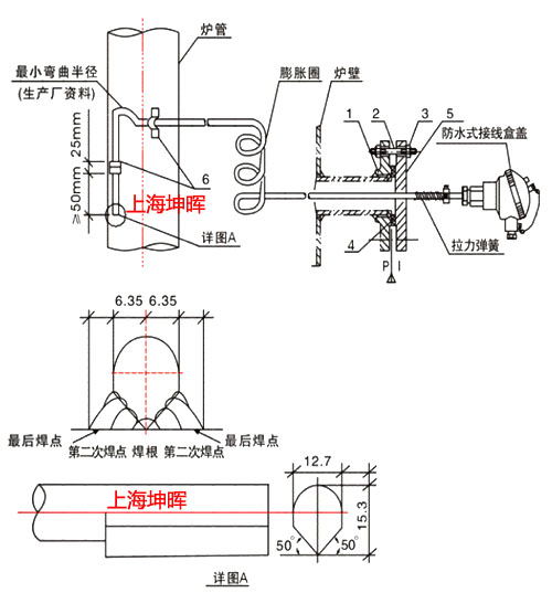 刀刃式、屏蔽刀刃式鎧裝熱電偶主要用于石化、電力、冶金、機(jī)械和食品工業(yè)中,加熱爐的爐壁及爐管溫度測量。它采用定位卡,將測量端的刀刃形熱電偶固定在爐壁等部位,通過測量端把感受到的溫度轉(zhuǎn)換成熱電勢信號,送