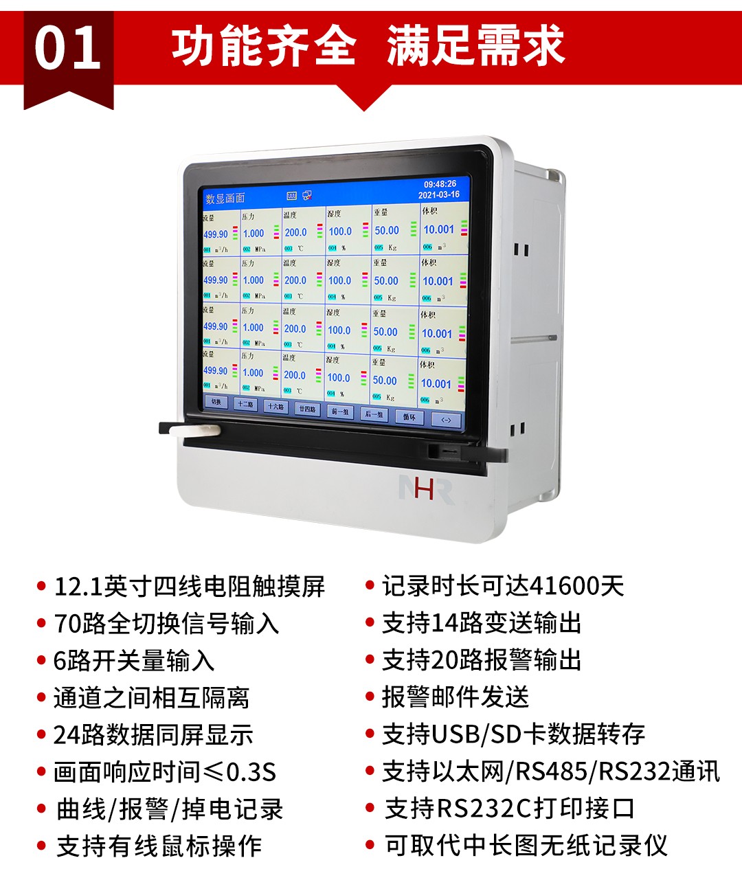 NHR-9100/9700系列觸摸數(shù)據(jù)采集控制工作站采用新型大規(guī)模集成電路,對(duì)輸 入、輸出、電源、信號(hào)采取可靠保護(hù)和強(qiáng)抗干擾設(shè)計(jì)。70路萬(wàn)能信號(hào)輸入。可帶20限報(bào)警輸出,14 路變送輸出,6路DI輸入,RS232/485通訊接口,以太網(wǎng)接口,微型打印機(jī)接口和USB 接口,SD卡插座;支持無(wú)線鼠標(biāo)操作。