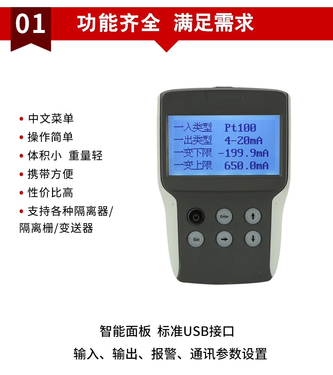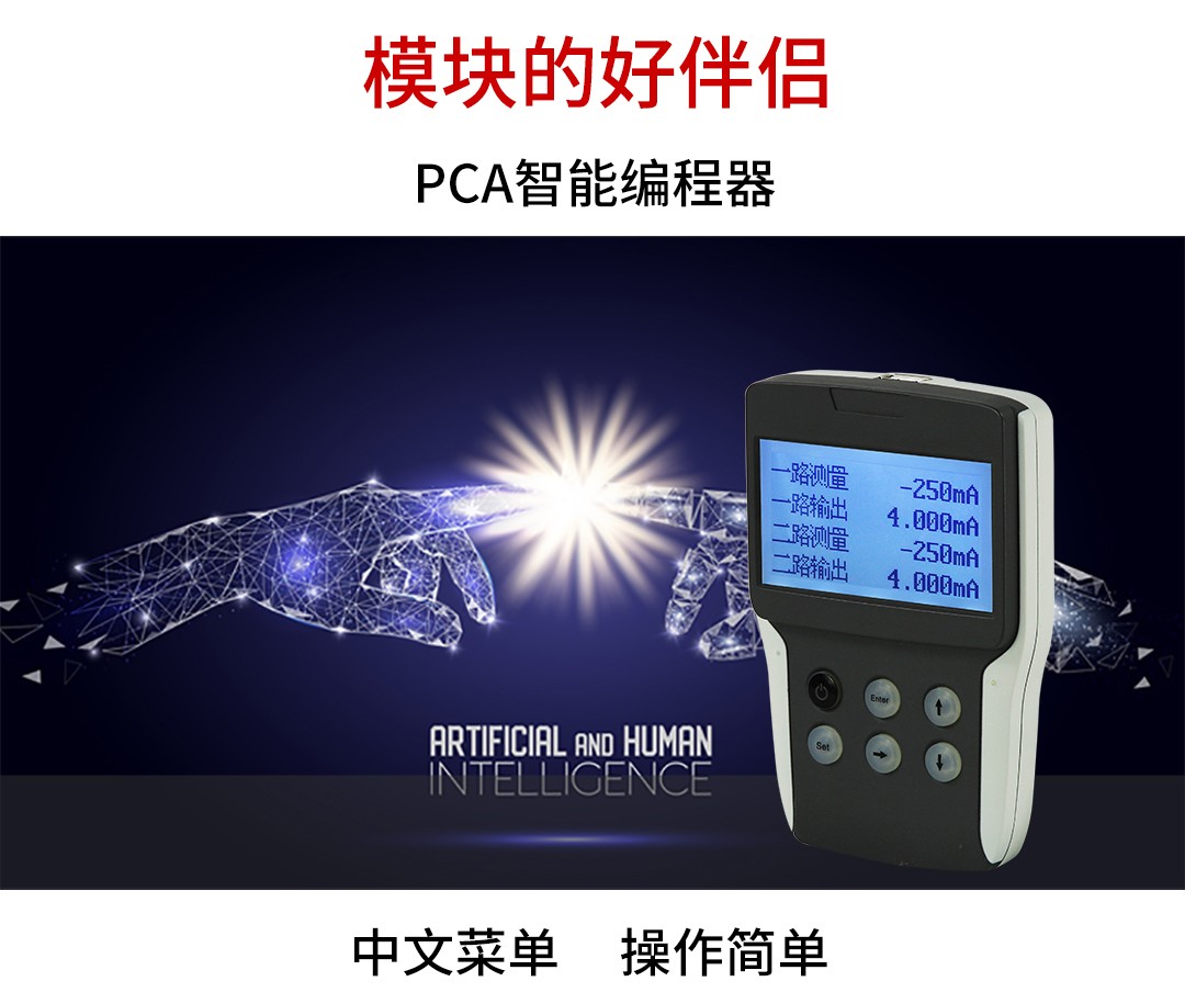 NHR-PCA手持式中文編程器適用于NHR智能隔離器、安全柵及電量變送器的參數組態編程,可實時查看測量值與輸出值;它的體積小、重量輕、攜帶方便,全中文液晶顯示,六個操作按鍵完成參數設置功能。